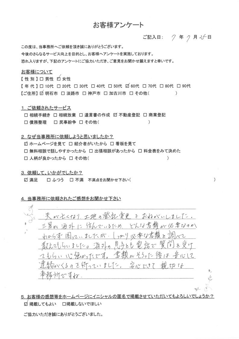 夫が亡くなり、土地の登記変更をおねがいしました。
