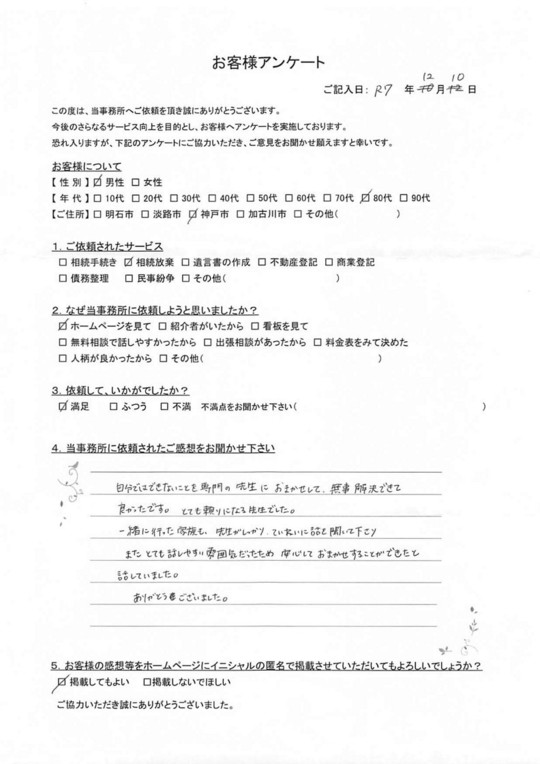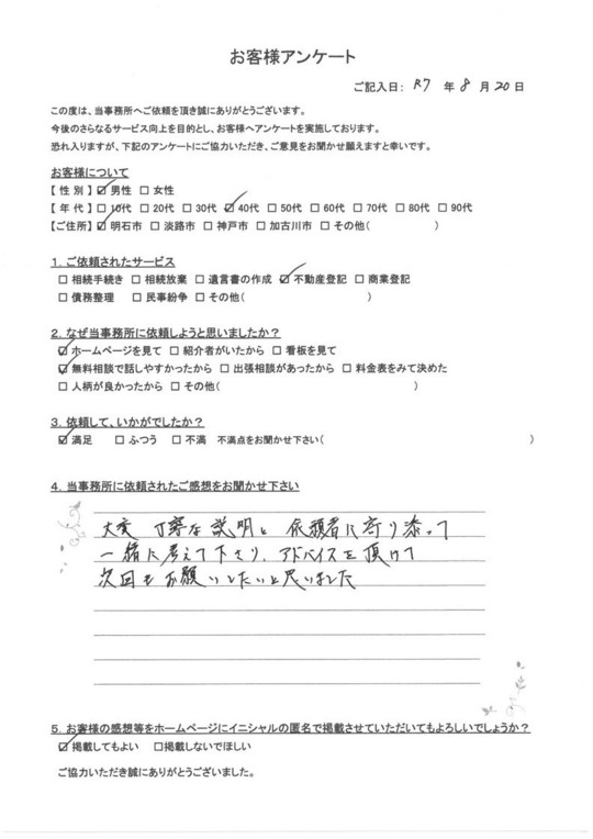 短い時間内に分かりやすく丁寧にご説明いただきましたが、それがご縁で手続きをお願いしました。