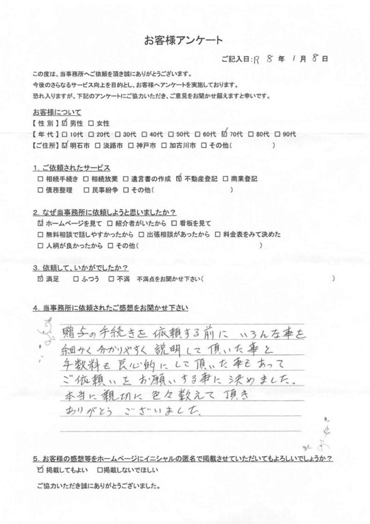 贈与の手続きを依頼する前に、いろんな事を細かく分かりやすく説明して頂いた事と手数料も良心的にしていただいた事もあってご依頼をお願いする事に決めました。