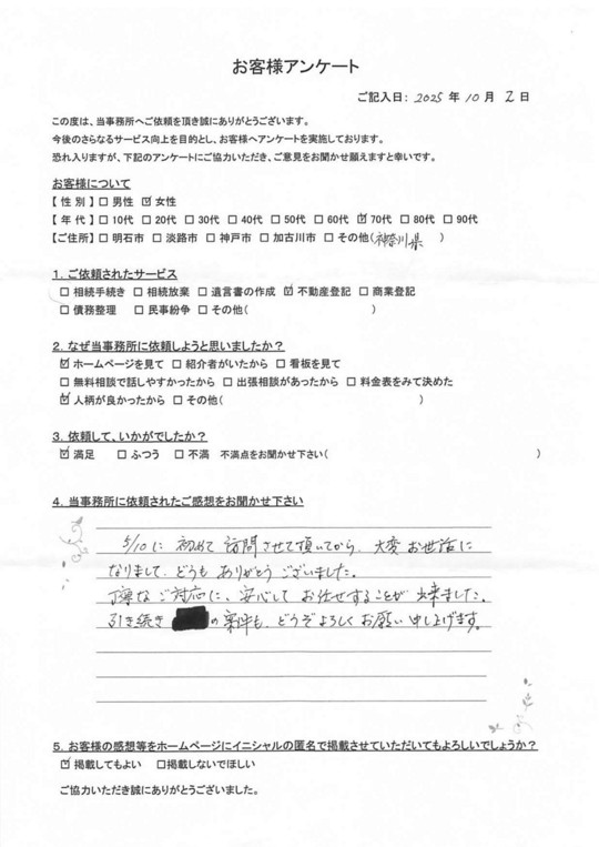 初めて依頼しましたが仕事ぶりが丁寧でお人柄も良く、法律上の注意点、裏技なども教えていただきました。